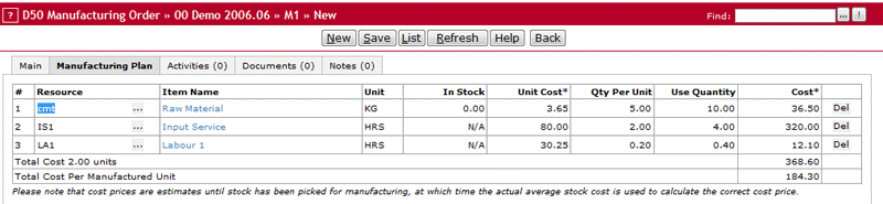 Balancing Input Labour It is important to understand the reason for accrual of labour expense and how to offset the Accrued Labour account. Accrued labour is used to monitor the cost of labour for an assembled item. This labour cost is part of the cost of goods sold for the assembled item when the assembled item is sold. At the same time, the labour expenses for the assembled order are also expensed as salary when running payroll. Hence, unless salary is offset with the accrued labour expense, the assembly wages will be expensed twice, because it will be part of both salary expense and cost of goods sold on the assembled item. Therefore, when running payroll the salary account needs to be credited by the value of accrued labour. This reduces the salary expense by the equivalent of the assembly wages part of the cost of goods sold of the assembled item. Example of a Assembly and Inventory Below a assembly order and how it affects inventory is displayed in screen shots. The following image displays the assembly plan for this item, including one raw material, one input service and one input labour item.