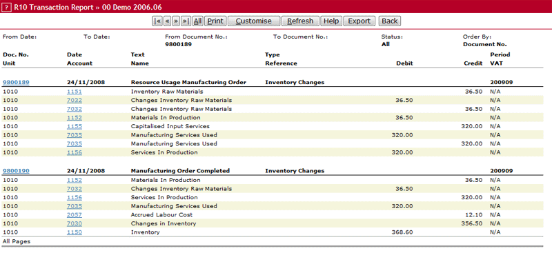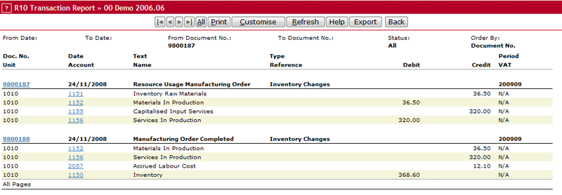 Financial Inventory Transactions No Accrual or Accrual w/Inventory ChangesProcessing the same assembly order using a different method from Direct Accrual will give the following two transactions after the order has been completed. The first transaction is captured for stage In Production, the second for stage Completed.