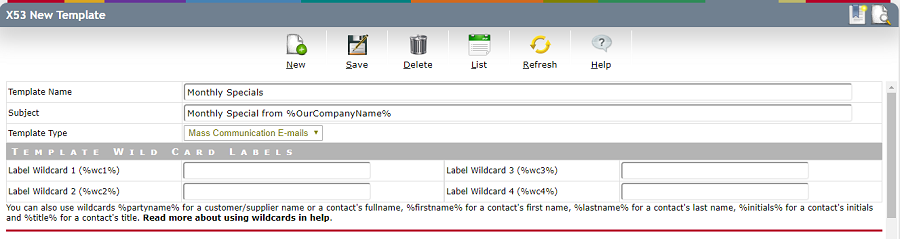 At the time of creating the template, no recipients are specified. However, labels can be added for up to four different general wildcards that can be used when producing the e-mails. This wildcards are in addition to the standard wildcards available.